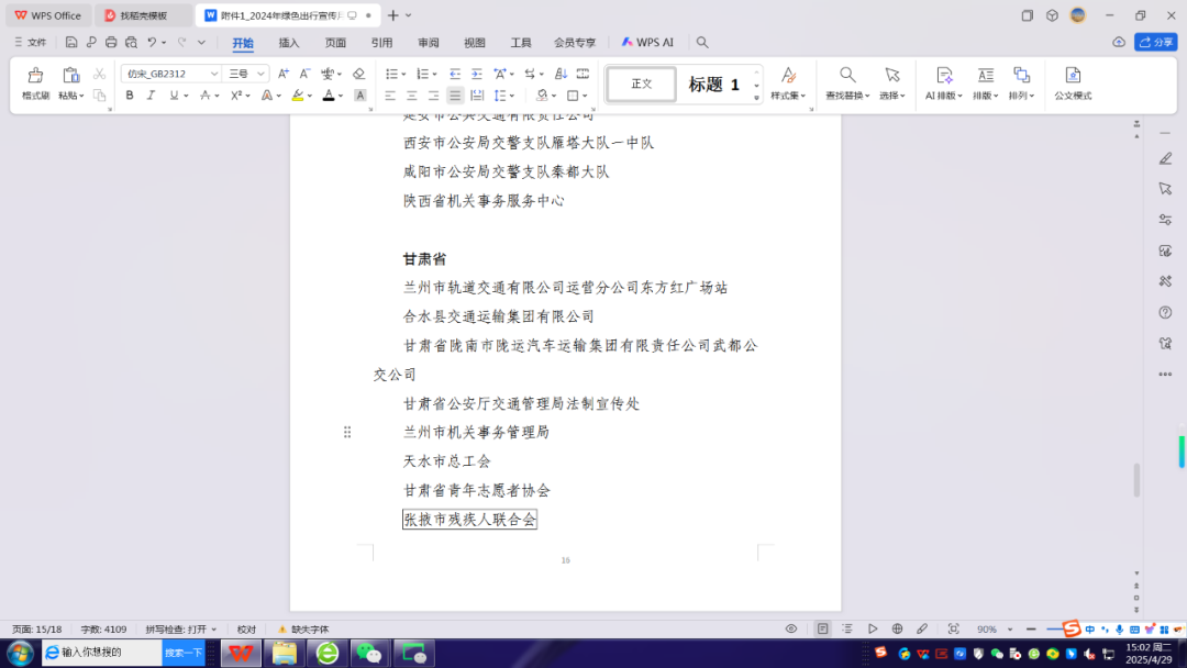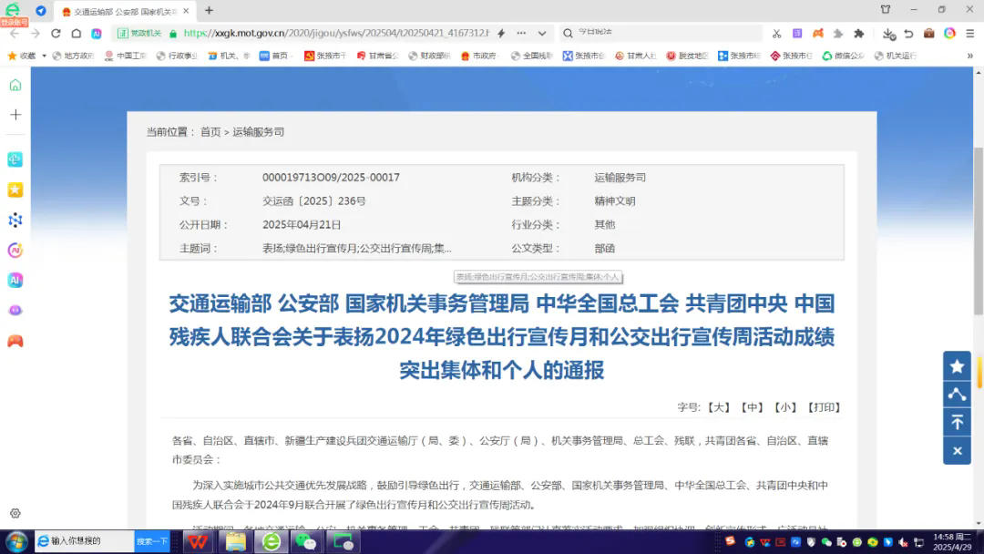图为张掖市残联被交通运输部、中国残疾人联合会等六部门联合评为“2024年绿色出行宣传月和公交出行宣传周活动成绩突出集体”。